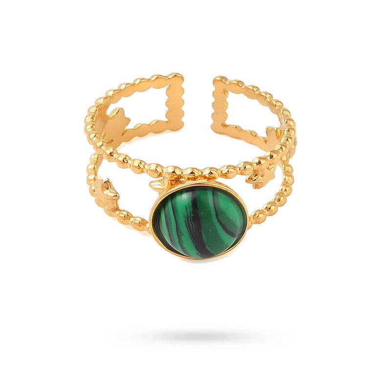 This stainless steel women's ring features a natural malachite stone cut into a star shape. Its refined design combines modernity... Read more