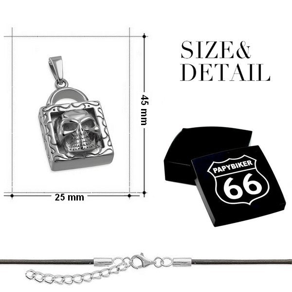 Pendentif acier 316 argenté Gothique Rock ou Biker - Tête de mort cadenas